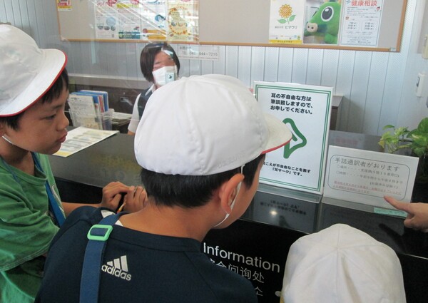 「赤ちゃんの駅」「補助犬」「手話通訳」「点字ブロック」「手すりの点字」「ピクトグラム」「給水器」「受付で案内してくださる方」「自転車を置き場」「ベビーカー置き場」などなど、「あった!」「これもそうだね」とたくさんメモをしていました。