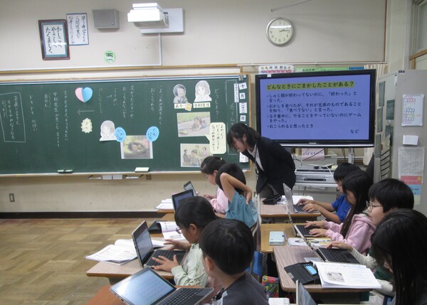各校でがんばる初任者の中で、道徳の授業参観を希望した方々が3年生の教室に集合しました。子どもたちは、「1,2,3・・20人もいる!」「もっといるよ!」「指さしちゃだめだよ!」「あ!校長先生~!」と大興奮です。