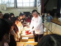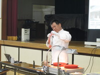 パティスリー・アプラノスの朝田晋平先生をお招きして、パティシエになるまでの歩みや、様々な選択において大切にしてきたことのお話や、実演を行ってくださいました。