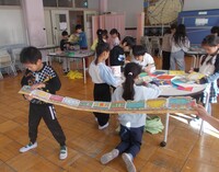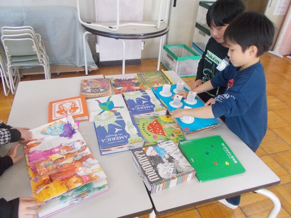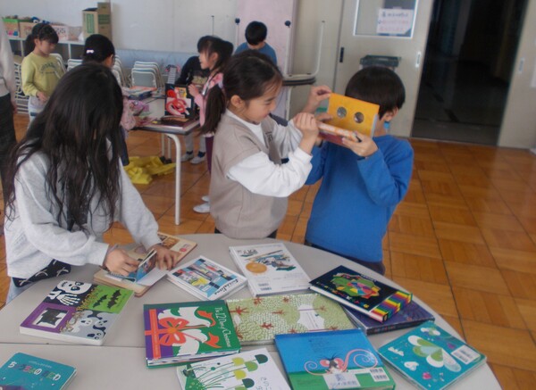 この授業は、様々な形態の本を鑑賞することで、造形的な本に対する興味・関心を高め、子どもたちの豊かな感性をはぐくむことをねらいとしています。