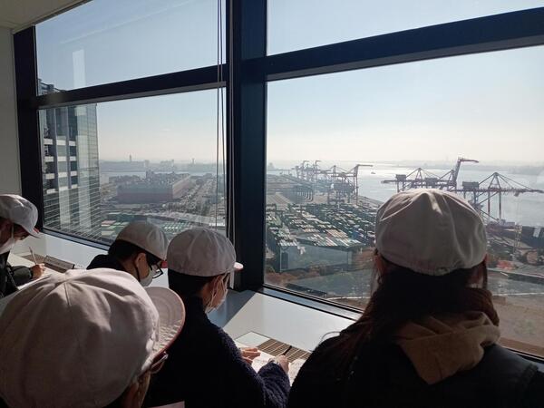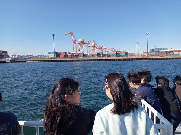 途中で乗船した社会科見学船では、ガントリークレーンに大歓声です。船、飛行機など海上交通網の広がりや流通、貿易、海上輸送の仕組みなどがよく分かりました。