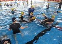 服を着たままではとても動きにくいことを実感し、服を使って浮く方法、ペットボトルやビニール袋など身近なものを使って浮く方法など、いざというときの生きる術を教えていただきました。