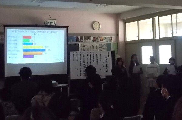 児童の発表は、夏休みのメディアコントロールについての取組をもとに、アンケートなども加えて分析し、自分たちで考えた課題と、その解決策についての発表でした。新しい発見と、子どもの思いが分かるよい発表でした。