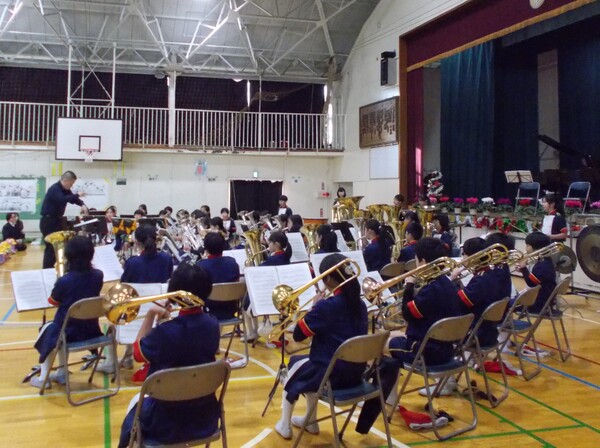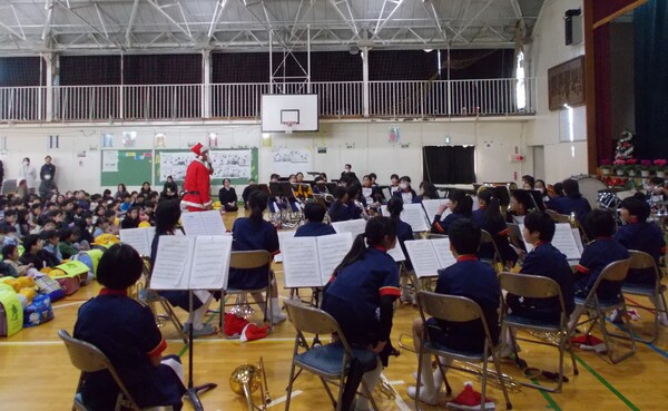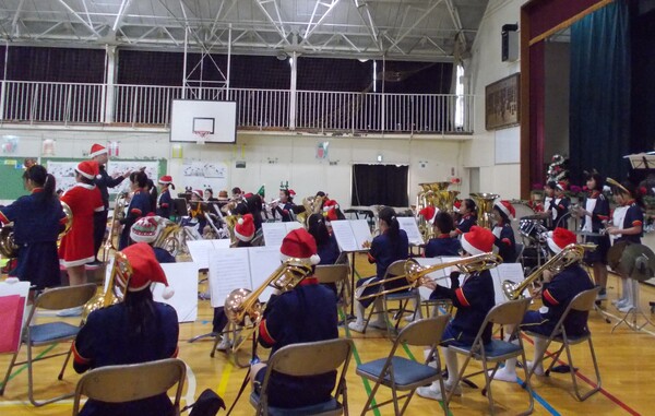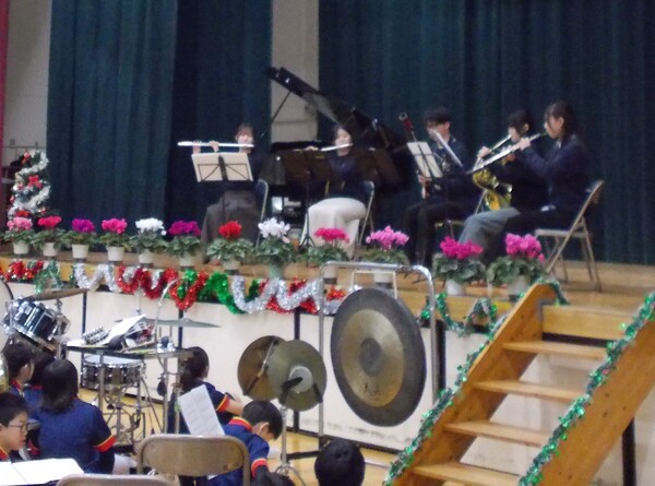 大学生という身近な先輩が、クリスマスソングを中心にステキな演奏をしてくださいました。金管バンドのみなさんも、日頃練習を積み重ねた成果を披露。