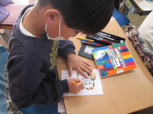 3学期頑張りたいことをそれぞれ書いている子どもたち。早く終わった子は丁寧に色塗りをしています。