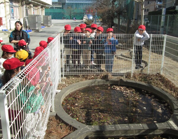 保健室をのぞいた帰り道、池の周辺で1年生がワイワイしていました。