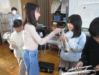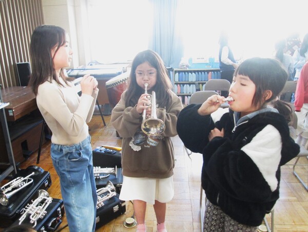 先輩部員が楽器の持ち方や音の出し方を優しく教えていました。
