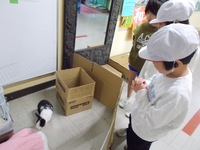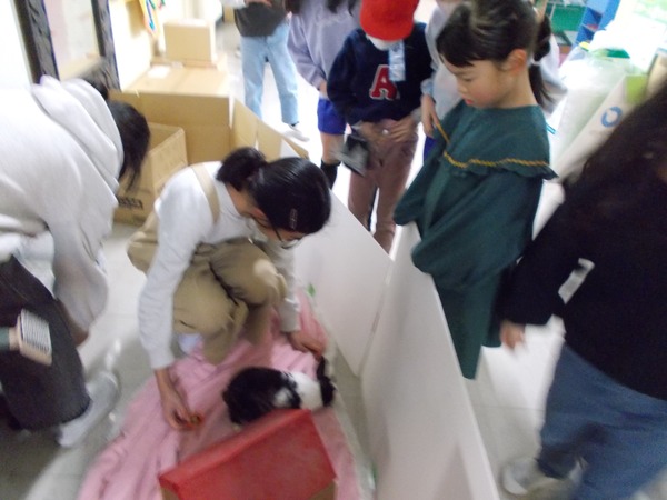 20分休みになると、飼育委員会の子たちが急いで職員室前に集まってキャンペーンの準備です。囲いを設置して、ココアをゲージから出して、餌で気を引いているうちにトンネルを設置します。みんながココアを見に来る前に準備をしなけれなならないので、飼育委員会の子たちは大忙しです。