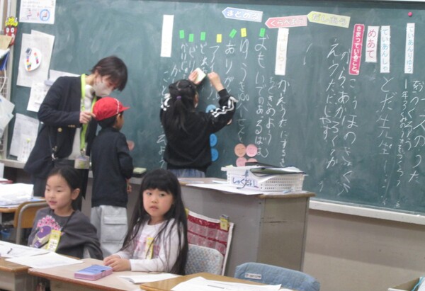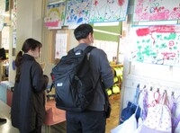 本日は幼稚園・保育園の先生が来校し、園を巣立った子どもたちの様子を参観。小学校の授業の様子や、作品、掲示物などをじっくりみてくださいました。