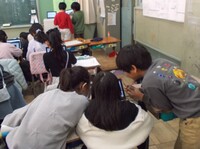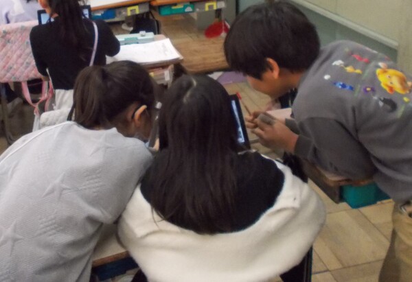 3年生の教室に行くと、1台のタブレットに何人もの子ども達が集まっています。何をしているのが気になってワークシートやタブレットを見てみると、「鹿手袋まつり」、「西南さくら祭」などの文字が見えました。どうやら地域の行事を調べているようです。