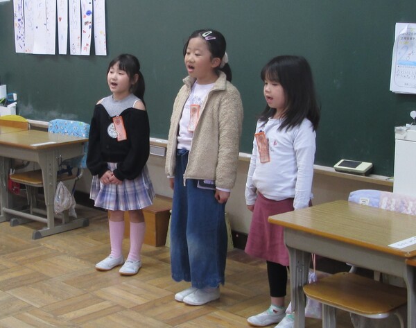 そのほかのクラスでは「できるようになったこと」を発表していました。毎日家でも一生懸命練習を重ねたであろう計算カードをすらすら読み上げたり、音読(ならぬすでに暗唱)をハキハキと発表したり、作文を発表したりしていました。一生懸命な姿は愛おしいです。