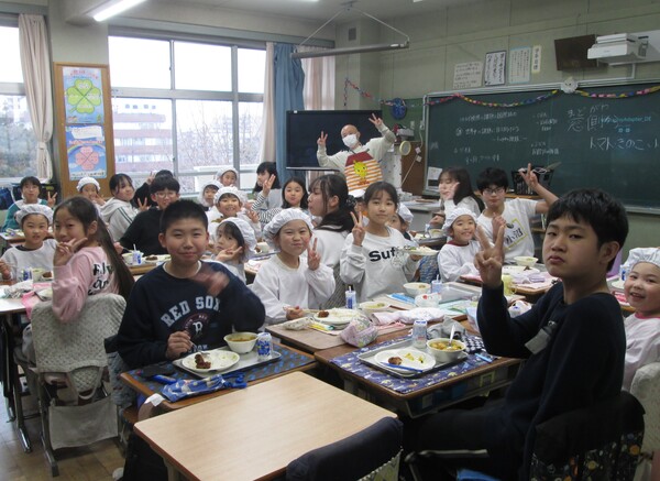 栄養教諭も盛り付けしやすく食べやすいメニューを工夫し、唐揚げジャンケンとジョアジャンケンで盛り上がっていました。