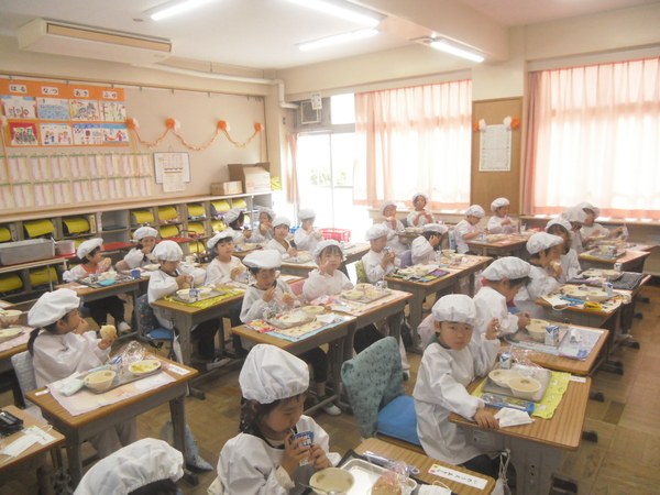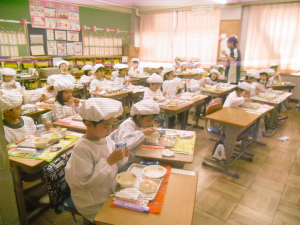 検食を終えて見に行ってみると、もう1年生は給食を食べているではありませんか。