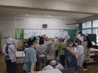 いよいよこれから、家庭科の学習、それも調理が始まるんだなあという服装です。