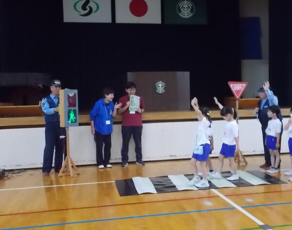 子どもたちは信号を見て、左右の確認、そして手をあげて歩き出すことを、実際に体験しました。